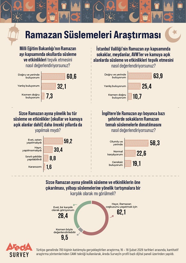 Areda Survey’in “Ramazan Süslemeleri” araştırmasına göre, toplumun yüzde 60,6’sı Milli Eğitim Bakanlığı’nın okullarda Ramazan süslemelerini teşvik etmesini doğru bulurken, katılımcıların yüzde 63,9’u İstanbul Valiliği’nin uygulamalarına destek veriyor. Katılımcıların yüzde 62,1’i ise Ramazan süslemelerinin yılbaşı süslemelerine bir karşılık olmadığını düşünüyor.