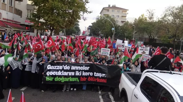 Yürüyüşte, İsrail’in Gazze’ye yönelik saldırıları protesto edildi. Cami önünde toplanan yüzlerce vatandaş, sloganlar atarak İlyasbey ve Bağdat Caddesi güzergahı üzerinden Kent Meydanı’na yürüdü.